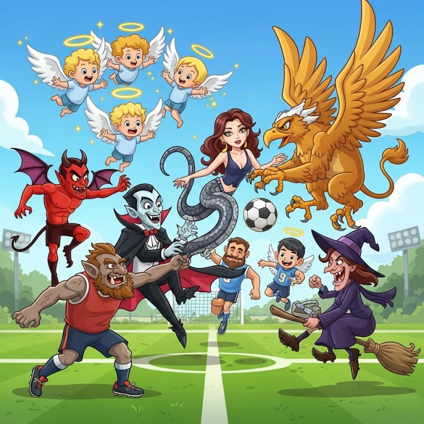 Des créatures légendaires peuplent aussi les surnoms des clubs. Anges (FC Spartak Trnava #583) et Diables (1. FC Kaiserslautern #544, CA Independiente #274, Manchester United #54, América Cali #718, RC Ferrol #1262, Altınordu FK #1275) sont assez communs. Le dragon souffle le chaud et le froid sur Porto (#6), sur Ljubljana (#380), sur Belgrade (#992), sur Ruse (#983), sur Goias (#1051), sur Mons (#1203), sur Wrexham (#1287) et Cannes (#560). D’autres créatures moins familières s’expriment aussi (le griffon pour le Genoa CFC #169, la vouivre pour l’Inter Milan #13 et l’AC Bellinzone #1018, le lion ailé pour Venise FC #1264, le troll pour Rosenborg #53, le phénix pour Gimcheon #1066 et CA Fénix #1211 et le papão pour Paysandu SC #441) quand il ne s’agit pas simplement d’un monstre (CD Marathón #431). Enfin, Dracula inspire les roumains de Bistrița (#1318).
